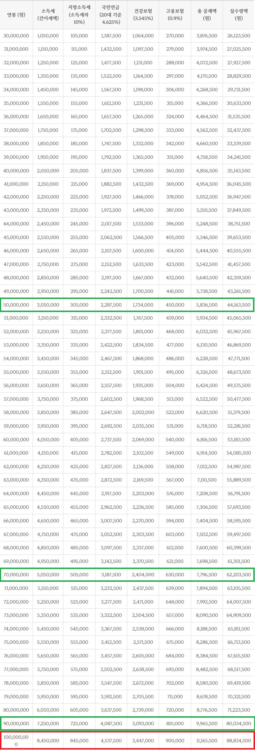 25년 연봉 5천만원 7천만원 9천만원 1억원 실수령액 계산 확인