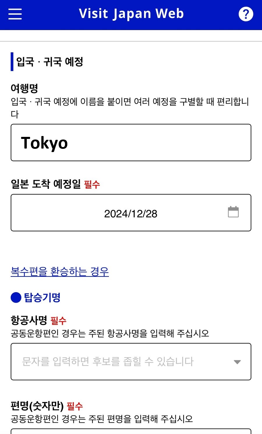 - 일본 도착 예정일 및 항공편 정보