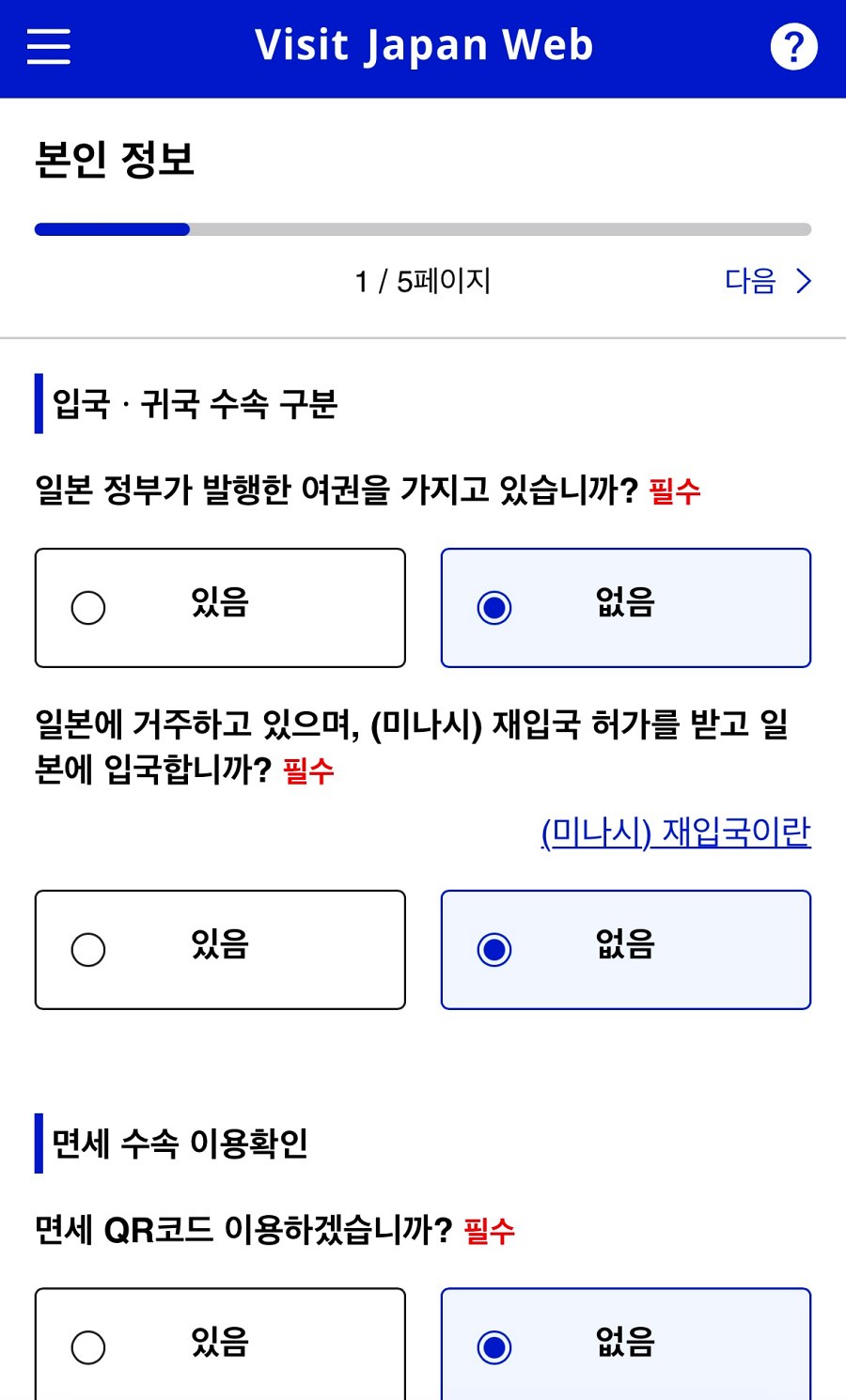 - 입국 제한 사항 관련 질문에 답변 (해당 사항 없으면 '아니오' 선택)