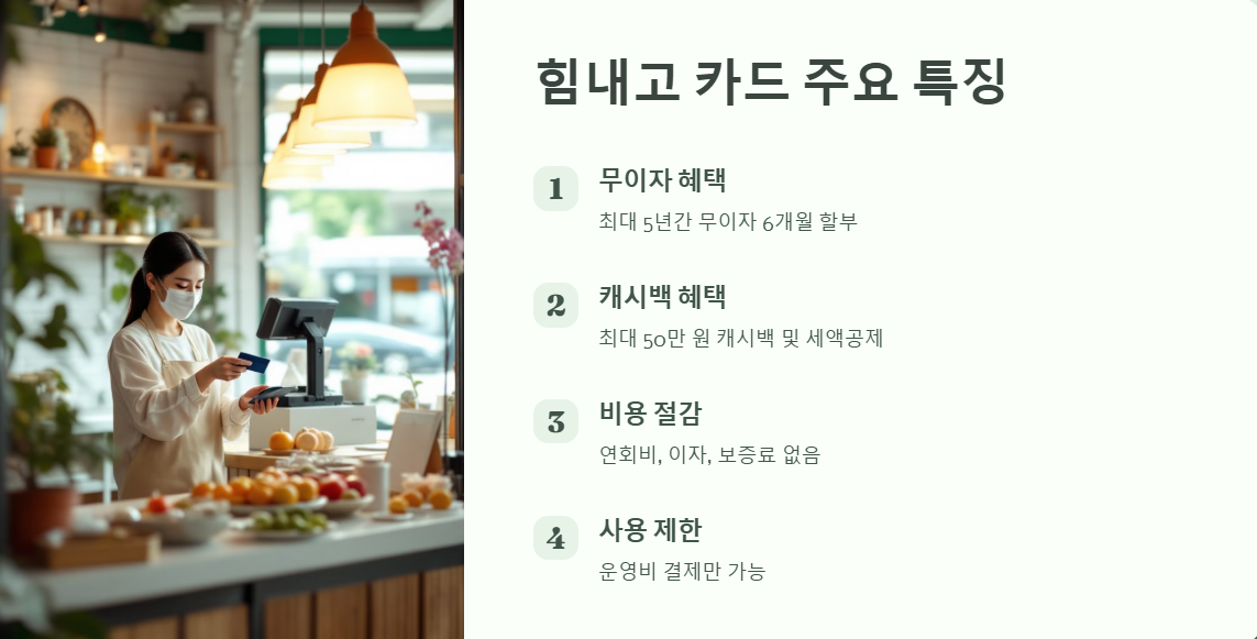 힘내고 카드는 경기도가 전국 최초로 도입한 소상공인 운영비 전용 카드입니다. 이 카드는 소상공인이 사업 운영에 필요한 자재비, 공과금 등을 결제할 수 있도록 설계되었으며, 다음과 같은 주요 특징을 갖고 있습니다.