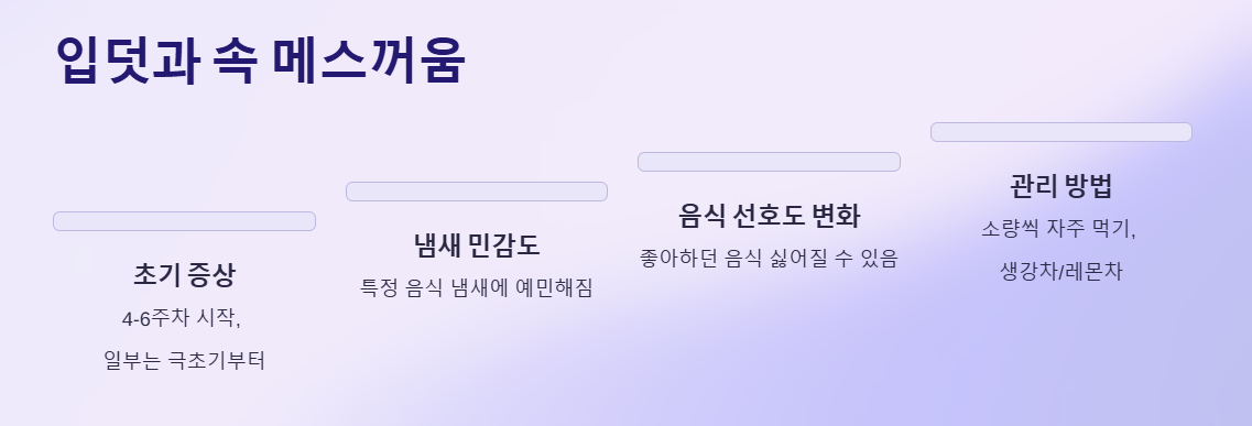 입덧은 보통 임신 4~6주 차에 시작되지만, 일부 여성은 극초기부터 메스꺼움을 느낄 수 있습니다. 특정 음식 냄새나 강한 향에 예민해지고, 평소 좋아하던 음식이 싫어질 수도 있습니다. 입덧이 심할 경우에는 공복 상태를 피하고, 소량씩 자주 먹는 것이 도움이 됩니다. 생강차나 레몬차 같은 음료도 입덧 완화에 좋으며, 개인별로 자신에게 맞는 음식을 찾아 조절하는 것이 중요합니다.