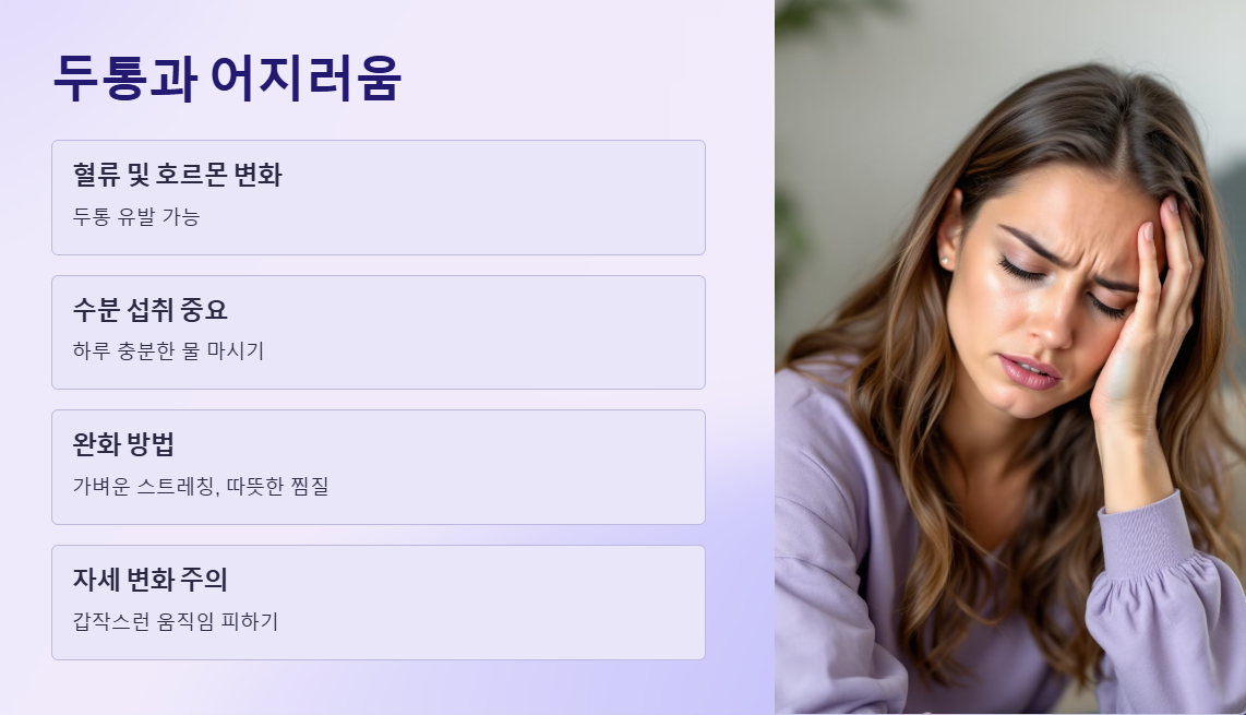 임신 초기에는 혈류 변화와 호르몬 변화로 인해 두통을 경험할 수 있습니다. 스트레스나 수분 부족이 원인이 될 수도 있으므로, 하루에 충분한 물을 마시는 것이 좋습니다. 가벼운 스트레칭이나 따뜻한 찜질팩을 활용하면 두통 완화에 도움이 될 수 있습니다. 또한, 혈압 변화로 인해 어지러움을 느낄 수도 있으므로 갑자기 일어나거나 급격한 자세 변화는 피하는 것이 좋습니다.