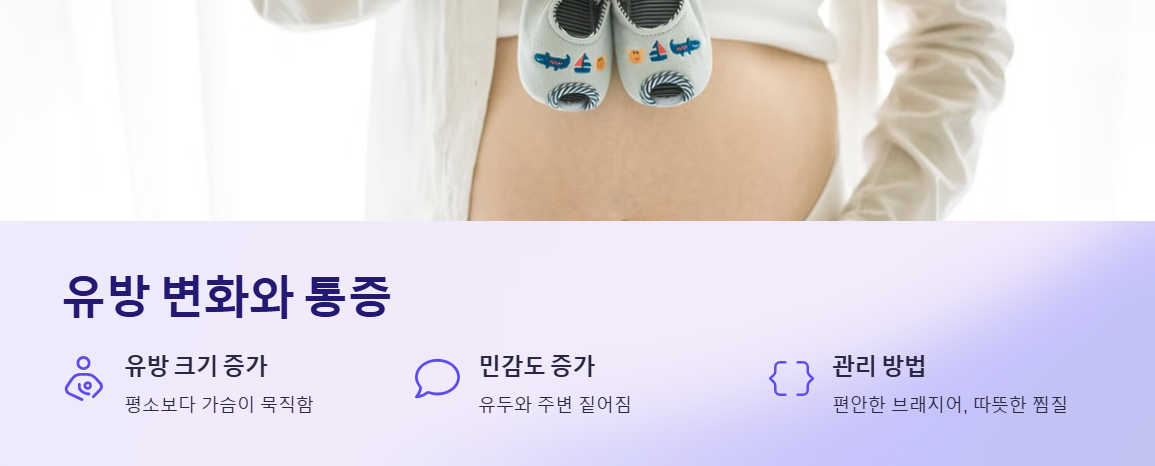 임신이 되면 유방이 커지고 민감해지는 변화를 경험할 수 있습니다. 평소보다 가슴이 묵직하게 느껴지거나, 유두와 그 주변이 짙어지는 변화를 보일 수 있습니다. 이는 호르몬 증가로 인해 유선이 발달하면서 나타나는 증상입니다. 가슴 통증이 불편할 경우 편안한 브래지어를 착용하고, 따뜻한 찜질을 해주면 증상을 완화하는 데 도움이 됩니다.