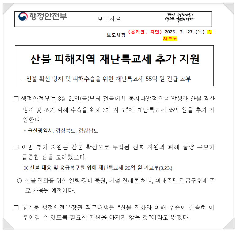 2025년 3월 발생한 대규모 산불로 인해 경북과 강원 지역에서 많은 피해가 발생했습니다. 산불 피해 주민들을 돕기 위해 기부, 자원봉사, 재난 지원금 신청 방법을 정리했습니다. 산불피해로 힘들어하는 모든 분들에게 도움이 되었으면 좋겠습니다.