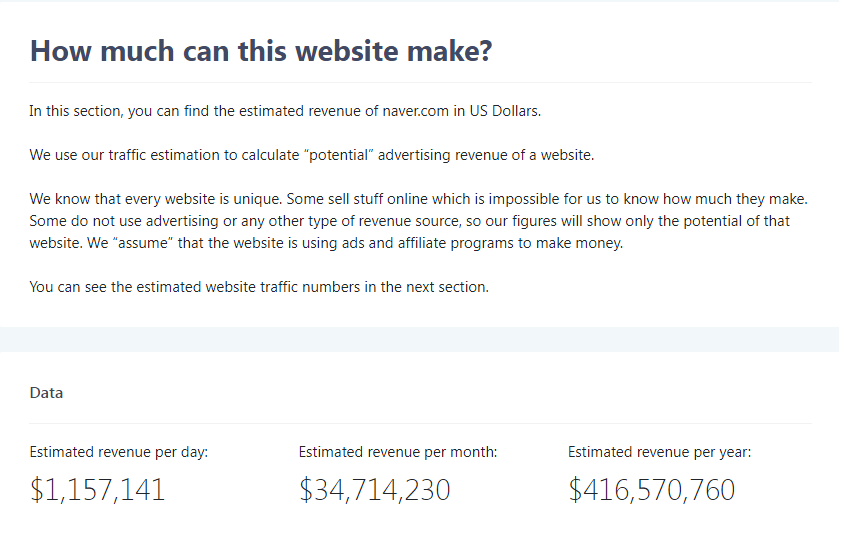 네이버의 가치는 3조7천억 달러이고, 1일 수입은 115만 달러, 1달 수입은 3,470만 달러, 1년 수입은 4억1천6백만 달러이다. 그러하다...ㄷㄷ
