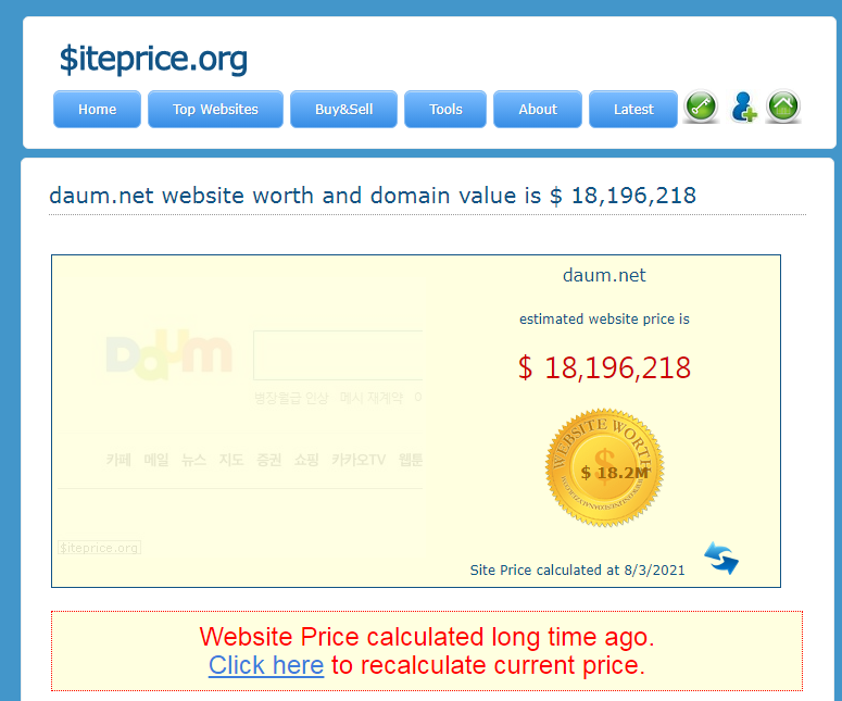 아무리 네이버가 다음을 압도했다고 하더라도 사이트 가격 차이가 너무 심하다. 음.. 어느 것이 맞는지는 알 수 없다. 다만 두 군데다 자신만의 알고리즘을 활용해서 가치를 평가해 주고 있다.