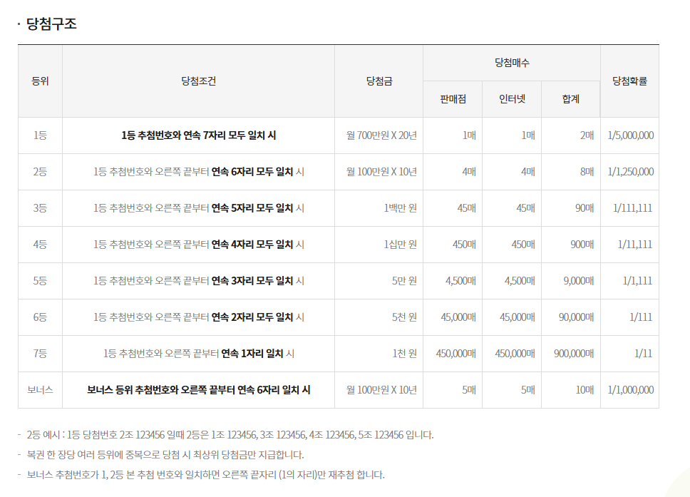 당첨구조는 1등부터 7등까지이며 보너스 당첨이 있습니다. 1등은 추첨번호와 연속 7자리 모두 일치할 때 당첨되며, 2등의 경우 1등 추첨번호와 오른쪽 끝부터 연속 6자리 모두 일치 시 당첨됩니다. 그외 당첨 구조는 아래와 같습니다.