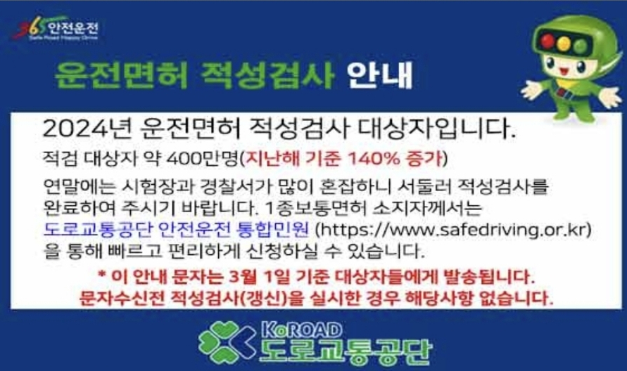 - 75세 이상: 3년마다 갱신, 적성검사 필수.