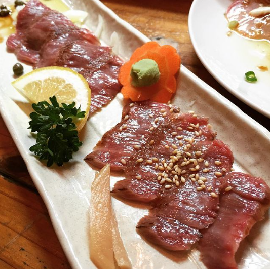 미야코규의 레어 스테이크 사시미: 고급 지방이 붙은 소고기.
